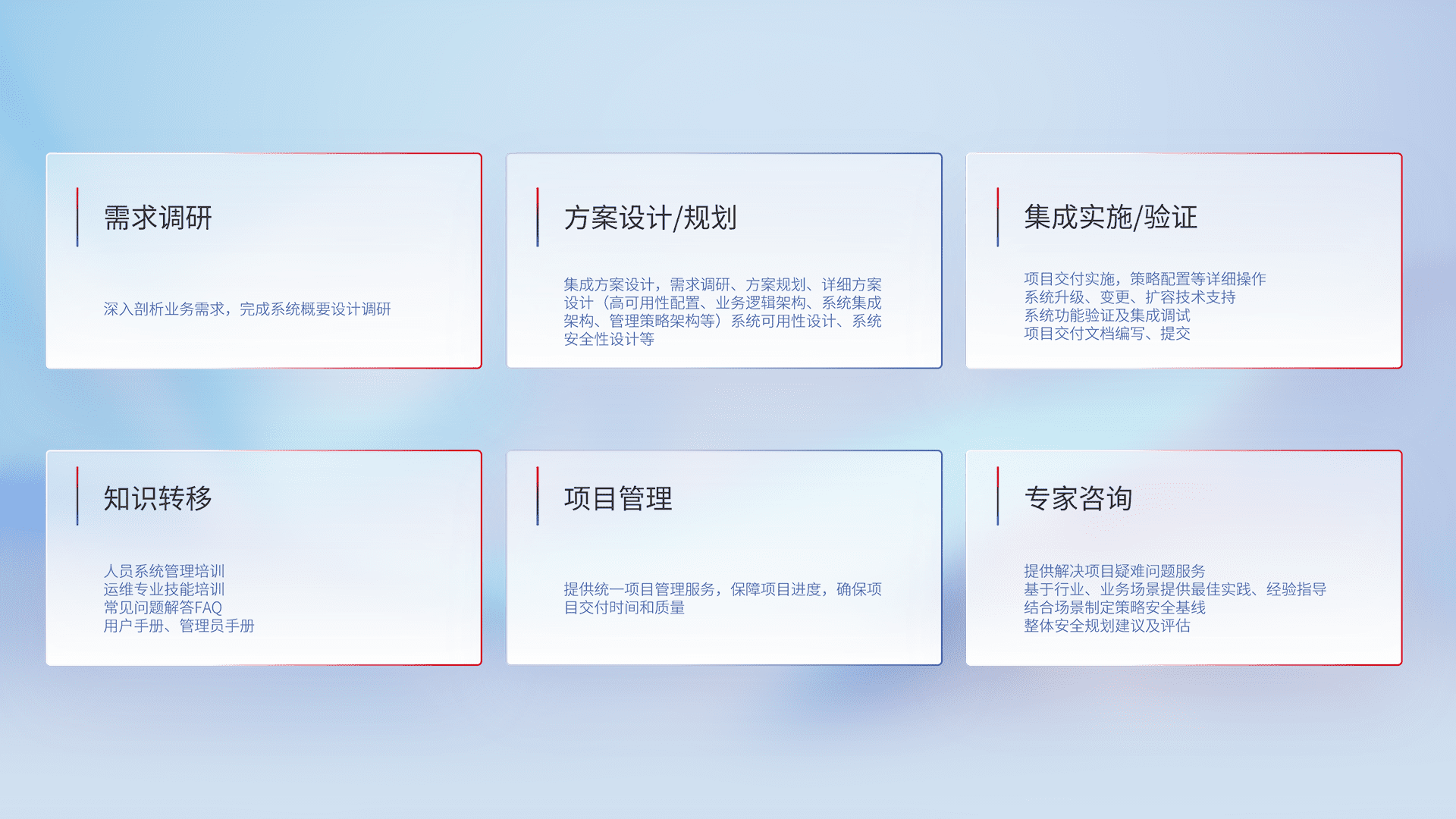 针对客户行业特性,,,将宏观的安全战略和需求,,通过专业的交付服务,,,,实现项目落地,,为客户提供标准规范的集成交付服务。。